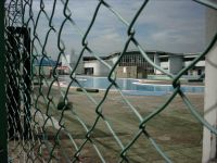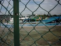 案内図を見ながら園内を軽く一周していると園外にプールがあるのに気づいた。確か、第27、 28話のウミヘビ嬢のエピソードでもグリーンセンターは撮影協力に名前が載っていたはず。もし かしたらこのプールかも知れないと思い、園入口でプールへの道のりを訪ねた。すると!何と、 プールは昨日、8月31日で閉鎖したと言う。泳ぎたい訳じゃないから水に入れなくても良いのだ が、閉鎖されていては中を確認する事も出来ない。だがここで諦めてはOZの名が廃る(爆)。とりあえずプールの近くまで行ってみる事にした。 案の定 プール入口には門が閉ざされ中を覗けそうもない。しかしこの入口には確かに見覚えが ある。やはりここでロケーションされていると確信した私はデジカメで何枚か写真を撮り(こう 言う時にデジカメは便利(笑))高く張り巡らされたフェンスに添ってプール周辺を歩いた。ど こかに隙間がないかと探しながら。ここまで来るとすっかりドロボウさん気分(^^;